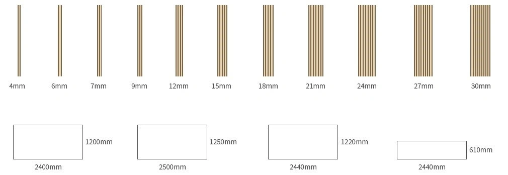 - 1200 / 1220 / 1250 / 1500 / 1525 × 2400 / 2440 / 2500 / 2700 / 3000 / 3050 / 3600 / 3660 mm